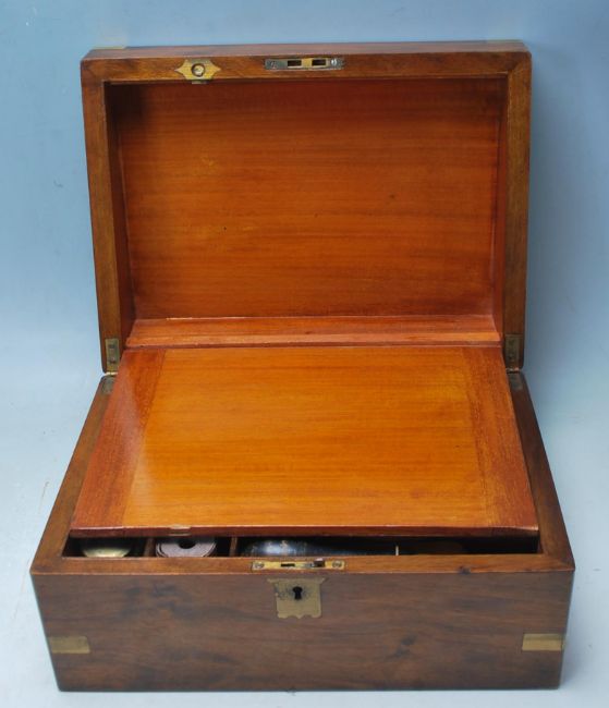 A George III mahogany writing slope of a rectangular form with brass cartouche atop and lock plate. Hinged lid opening to reveal a stunning mahogany fully appointed interior with tooled blue leather writing skiver and sectional top. Glass inkwells with metal covers.