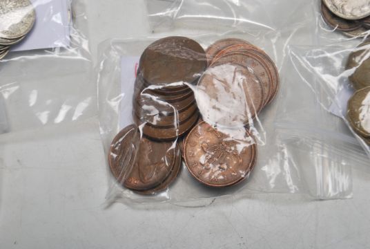 A collection of 20th Century mixed coinage to include 19th century and later pennies, commemorative crowns, world currency including some notes, three pennies etc.
