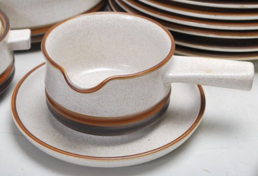 A large vintage mid century Denby stoneware pattern dinner service comprises soup bowls, tureen, small lidded pot, large plates, cup and saucers. All marked Denby made in England. Measures 26cm in diameter.