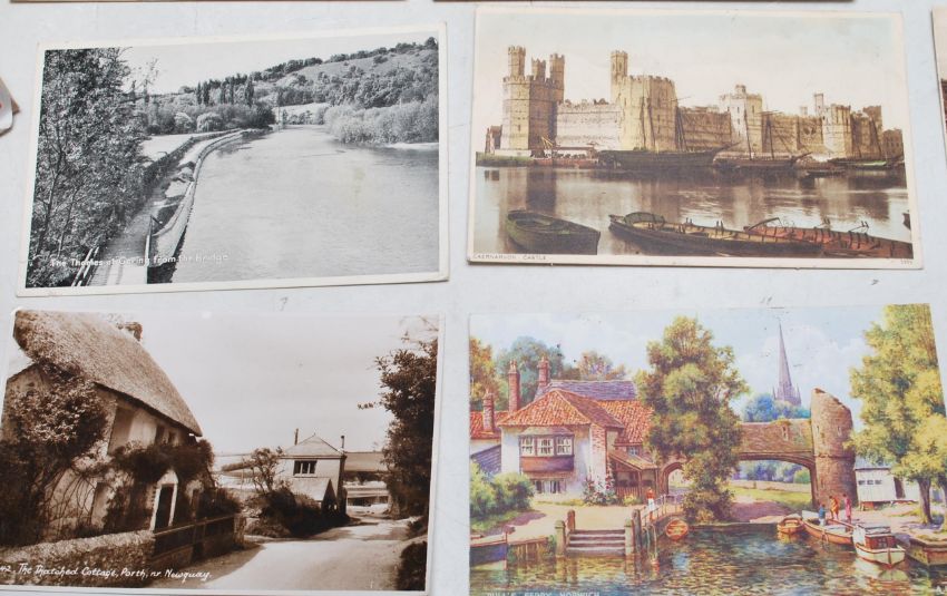 Picture Postcards 1930s-1950s All postally used with GB King George 6th / VI stamps. Of interest to stamp, postmark and postcard collectors in addition to genealogists for names & addresses / family look up. Many WWII era with related cancels.Shoebox of 600.