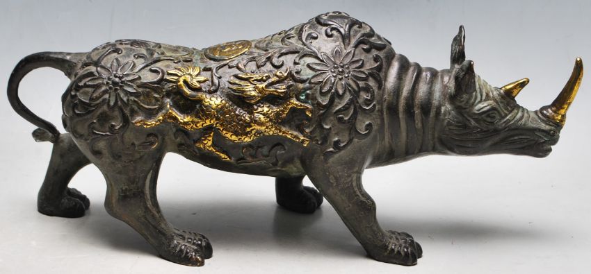 A vintage 20th century Chinese bronze rhino having embossed floral decoration with gilt detail of a dragon to the side and horns. Four character stamp to the underside