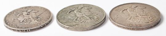 A group of three coins to include a silver 1820 George III Georgian crown with a George and the Dragon design set within a garter and bust facing right to the verso, a silver 1893 Victorian crown with George and the Dragon and the old head facing left, and a 1951 five shilling coin with George VI facing left.
