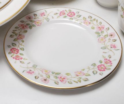 A vintage mid 20th century Royal Doulton Woodland Rose pattern dinner service comprising of tea cups, saucers, bowls, serving dishes, gravy boats and more. The dinner service has floral decoration with gilt edging and makers mark to the verso.