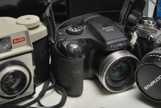 A large collection of vintage camera equipment to include a Kodak box brownie, Sony Ericcson cyber shot, Panasonic NV S90, Hanimax, Lumix FZ45, Olympus Pi 5000, Finepix s5800, Vivitar 2500 flash, Olympus Stylus 1, Telesor Auto 1, Canon xus 132, Kodak Cresta 3 and more