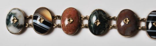 A 19th Century Victorian yellow metal and agate panel bracelet having ten oval panels of different coloured agate including banded agate each united by two links mounted on a tongue and groove clasp. Measures 16.5cm. One fitting missing.