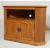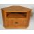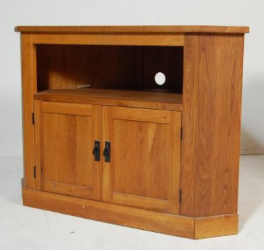 A pair of contemporary oak corner units / entertainment units / corner cupboards having flared tops with recess beneath and twin cupboard doors with ebonised pull handles.