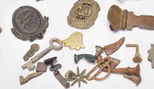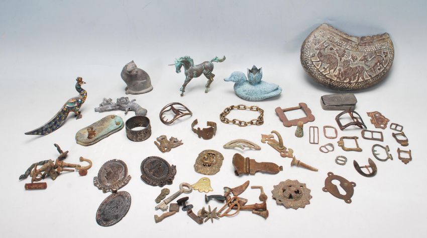 Metal detector finds - A collection of various findings from a local metal detectorist, to include a wide selection of buckles, a boot spur, a miniature sitting bull toy gun, a snuff box with engraved initials to the lid, a cast bronze unicorn figurine, a cast metal cat sculpture, an enamelled peacock figurine, an Indian engraved metal vessel decorated with lions and antelopes.