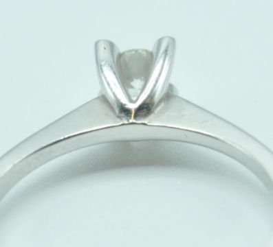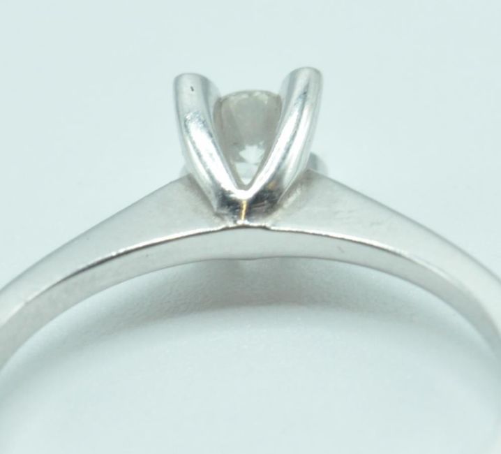 A 14ct white gold and a diamond solitaire prong ring set with a brilliant cut diamond. Stamped 14k. Diamond estimated 16pts. Weight 2.4g. Size M.