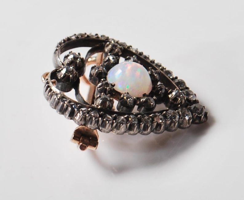 An early 20th Century antique opal and diamond heart brooch having a central opal cabochon set within a heart shaped open work mount set throughout with old cut diamonds. Hinge pin and pendant bale to verso. Weight 4.9g. Measures 2.5cm.