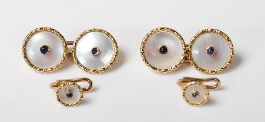 A set of vintage 14ct gold gentleman's mother of pearl cufflinks and collar studs to include one pair of cufflinks and one pair of collar studs each having round mother of pearl panels with central sapphire cabochons (one sapphire damaged), set within a Emil Jager jewellers box. Marked 585. Total weight 9.0g.