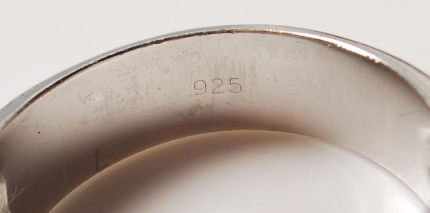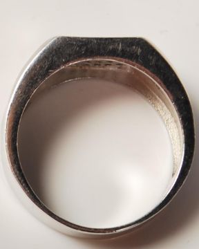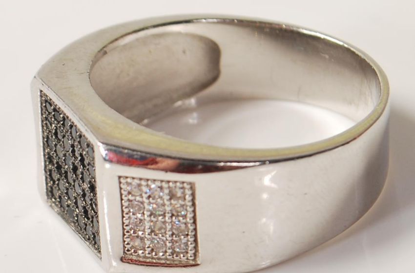 A stamped 925 gentleman's silver ring set with a central panel of black stones with two further panels of white stones to the shoulders. Marked 925 to the band. Weight 11.3g. Larger than size Z.