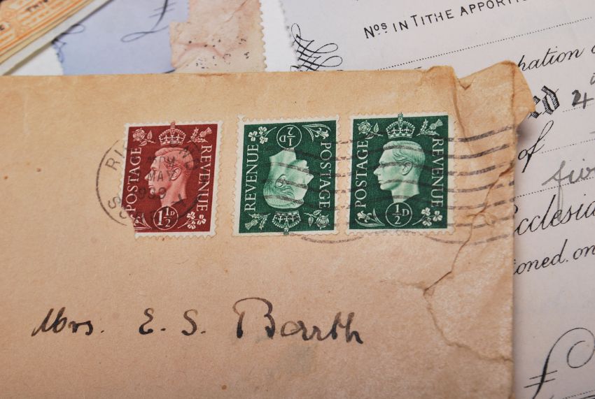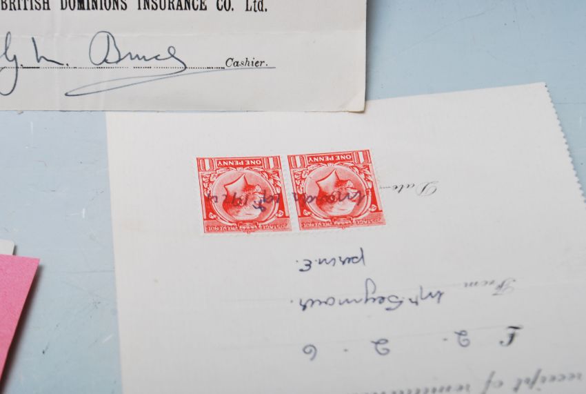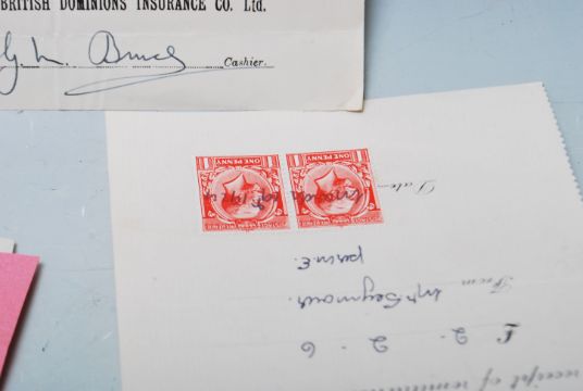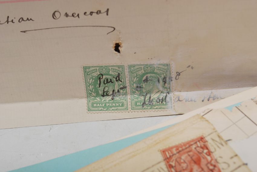 British Postal items/bills & receipts - a collection of over 70 envelopes / postcards / lettercards / ephemera all with postage stamps from all four Kings Edward 7th to George 6th. Unusual selection in vintage sewing box.
