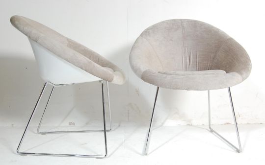 A pair of vintage retro 20th century Danish inspired tub chair / easy chair / egg chairs having grey fabric upholstery with white fibreglass seat shell raised on chrome metal supports.