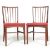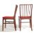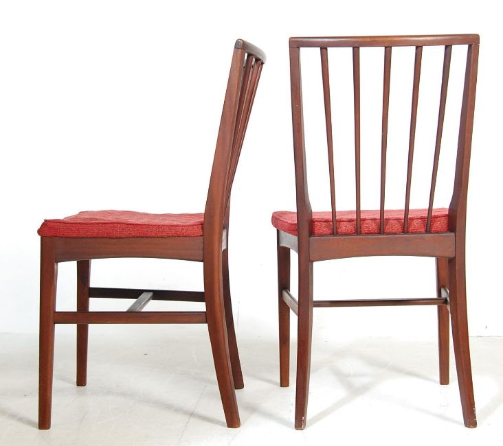 A set of four teak wood Gordon Russell dining chairs having curved spindle backrest, padded seats raised on tapered supports united by stretchers. Measures 85 H x 40 W x 47 D