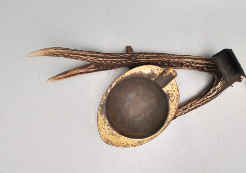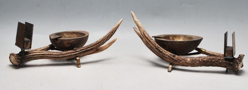 A pair of retro vintage 1960s mid century novelty ash trays having resin bone antler supports with a half coconut dish with brass match striker to the rear. Measures, 28 cm Long.