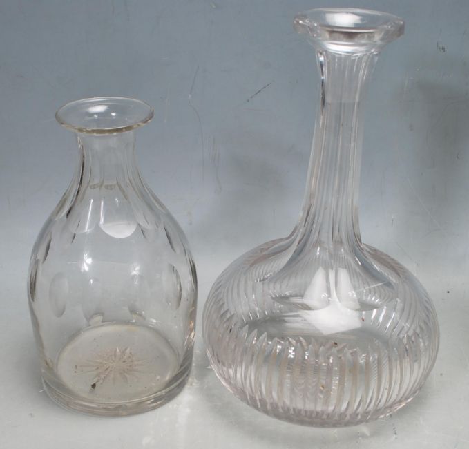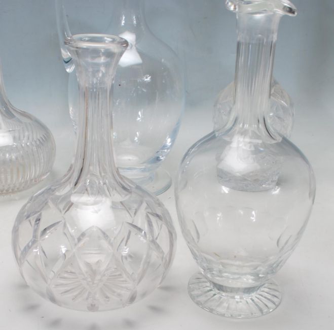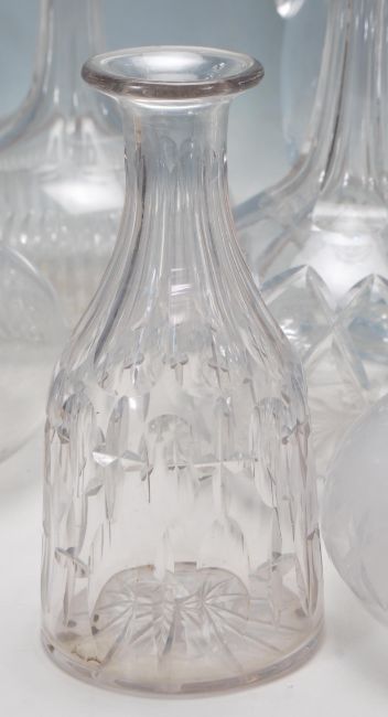 A collection of nine, 19th century Victorian decanters / cut glass decanters of baluster form with geometric decoration. Some of them with stoppers. Measures, 30 cm tall
