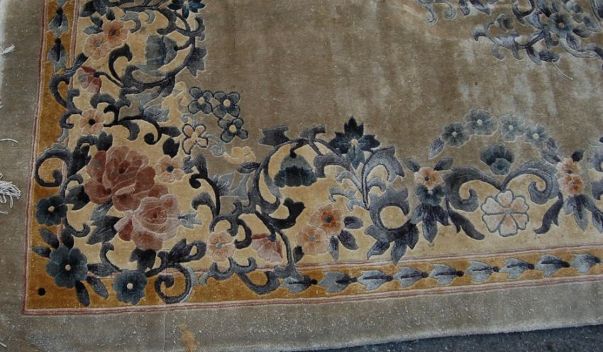 A large 20th century thick woollen Chinese floor rug carpet. Of beige colour with central design having foliate sprays etc all within geometric borders. Complete with tassled ends.