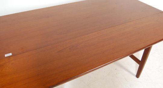 A 20th Century teak wood retro Danish dining table, the table with a single drop leaf raised on shaped tapering supports united by stretchers.