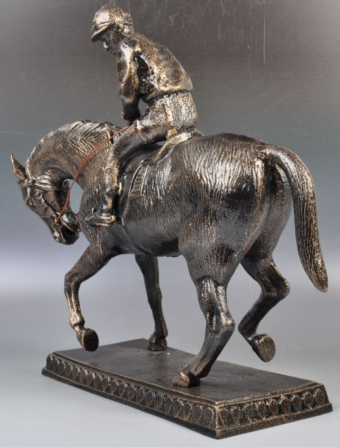A large 20th century decorative bronze effect cast metal statue of a Jockey & Horse. Modelled in traditional form, with the jockey atop the horse, holding reigns. Mounted on a squared decorative base. Measures approx; 42cm tall.
