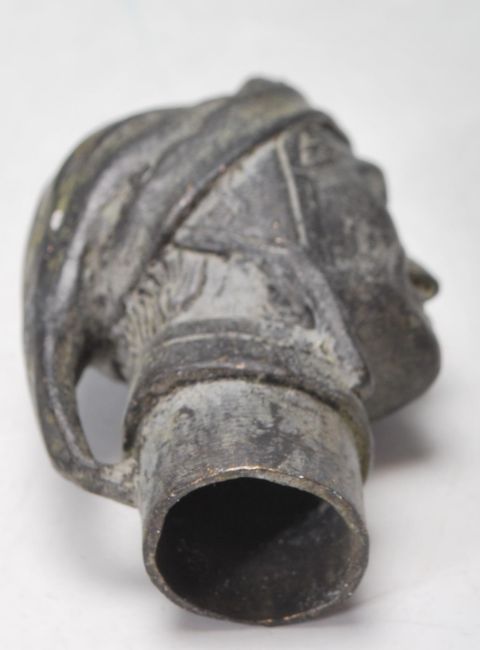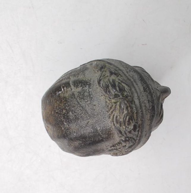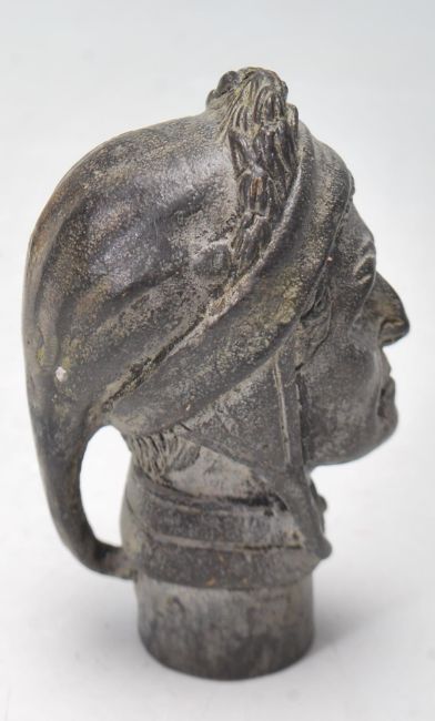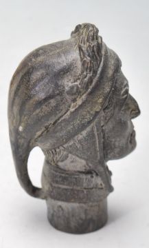 A contemporary cast figural metal walking stick handle / knop in the form of Dante wearing his traditional hat and wreath.