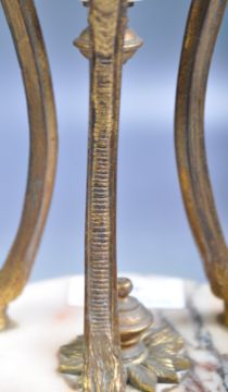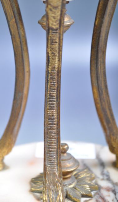 A matching pair of antique 19th Century Grand Tour Italian sienna marble and brass urns of decorative form. Each urn vase having gilt brass rims and black painted brass slip below with classical face masks having scrolled and feathered crowns terminating to slender supports upon hoof feet. Raised on a circular marble bases with brass central finial and further brass beaded decoration with turned brass feet below. Each measures approx 32cm x 14cm.