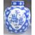 An antique early 19th Century Chinese Oriental Kangxi mark porcelain ginger jar having blue and white hand painted decoration in the prunus pattern with large white cartouche panels depicting precious objects such as vases, scrolls, tables etc. Complete with matching cover or lid. Six character Kangxi reign mark to base in blue. Restoration to lid and body. Measures approx: 29cm tall.