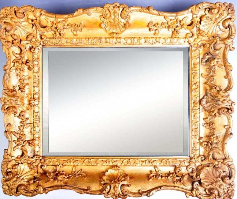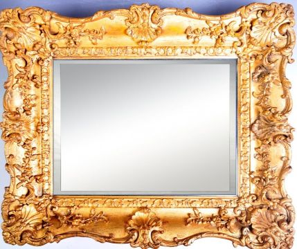 An antique 19th Century Rococo influence gesso gilt painted plaster & wood wall mirror. The rectangular mirror panel set within an ornate carved frame set with acanthus leaves, scrollwork and floral medallions. A good period example complete with metal hanging chain. Measures approx; 57cm x 48cm.