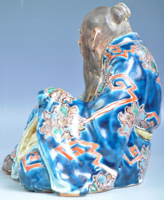 An antique 19th Century Chinese Oriental ceramic figure of an elder in a seated position adorned with garments having detailed hand painted floral and patterned decoration. The Chinese figure shown holding a gilt spherical object in his right hand. Unmarked. Measures approx 16cm x 14cm x 13cm. Condition: overall good just age related wear to the paint work.