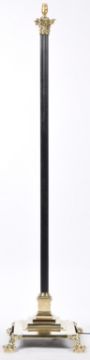 A good antique early 20th Century English polished brass standard lamp light of Corinthian column form having a polished top with ebonised central column. Raised on a stepped square base upon a lion paw feet supports. Rewired. Measures approx 160cm x 39cm x 39cm.
