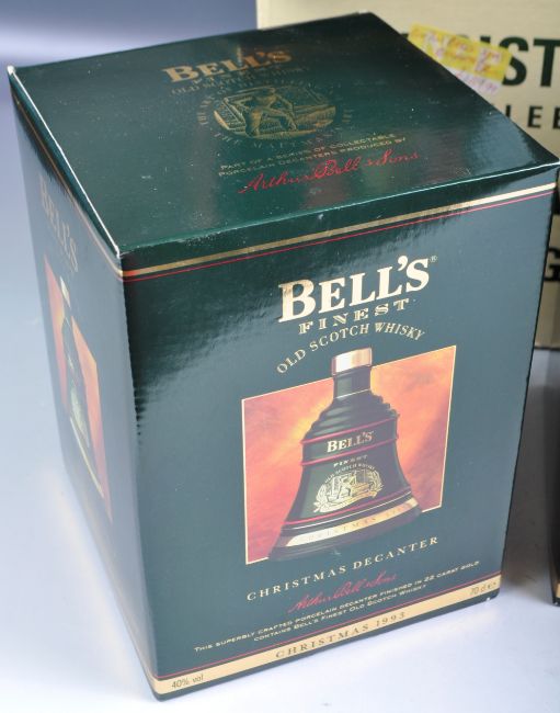 An impressive set of six Arthur Bell & Sons  Bells / Bell's Finest Scotch Whisky Christmas Decanter 1993 porcelain decanters with contents complete in original presentation boxes. Stored within the original trade box. 40% 70cl.