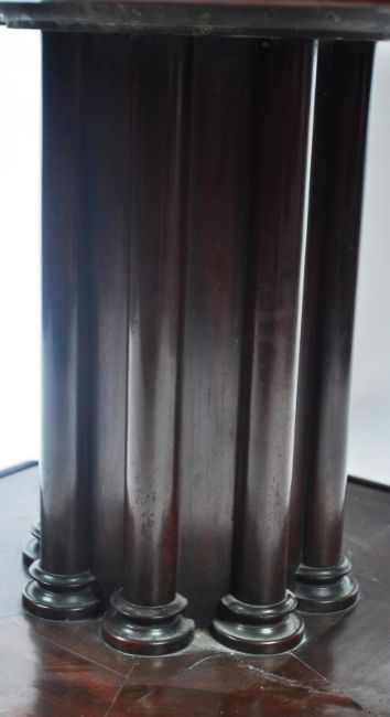 A superb early 19th Century Georgian English solid mahogany library / rent / dining drum table of hexagonal form having a flared top of paneled sides to the frieze interspersed with four hidden drawers. Each drawers having brass locks. The top supported upon a cluster column raised on a hexagonal plinth base. A quilty example. Measures approx 77cm x 129cm. Please note - the top sadly not retaining the original peg and no keys present.