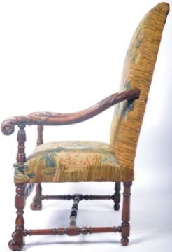 A large and impressive antique 18th Century French walnut tapestry armorial throne armchair / arm chair having a green ground with intricate floral bouquets, carved oak leaf arm rests raised on block and turned supports with H stretcher and carved hairy paw feet. Measures approx: 115cm x 65cm x 70cm.