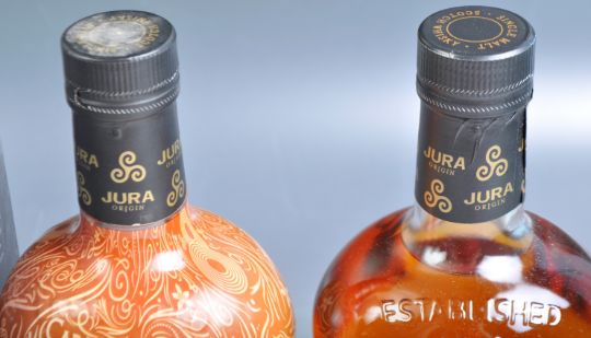 Two bottles of Jura Origin Ages 10 Years Single Malt Scotch Whisky comprising a boxed example and a Special Edition. 70cl 40%. Great bottles