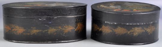 Two antique early 19th Century Georgian Regency period hand Pontypool painted toleware pots having scenes of chickens and pheasants, flamingos and other birds. Comprises a circular and oval example. Measures approx; 13cm & 16cm wide.