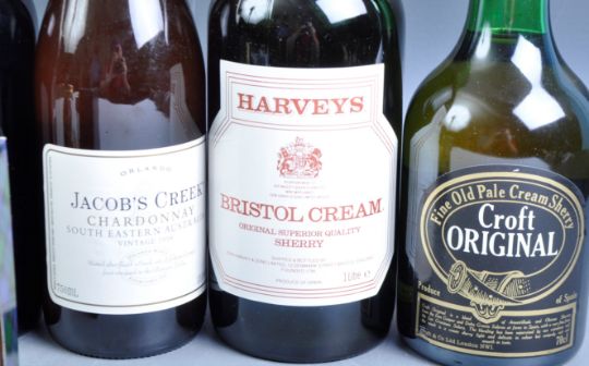 A collection of assorted alcohol and spirits comprising Harveys Bristol Cream, Martini Rosso, Jacob's Creek Chardonnay, VSOP Bardinet Brandy, Croft Original, Three Barrels Brandy along with various smaller bottles / miniatures. Good collection.