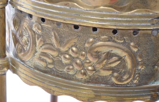 A charming antique 19th Century Victorian Aesthetic movement brass kettle on stand. Comprises a detailed kettle with wooden ebonised handle atop decorated with stylised panels of flowers and classical face masks. Raised on a tubular scroll burner stand with 'x' stretcher and ball finials. Measures approx: 83cm tall