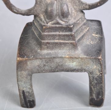 An antique 19th Century Indian Hindu bronze altar piece figurine group likely depicting Vishnu with His Consorts, Lakshmi and Sarasvati flanked to each side among flames raised on a table base. Measures approx; 24cm tall.
