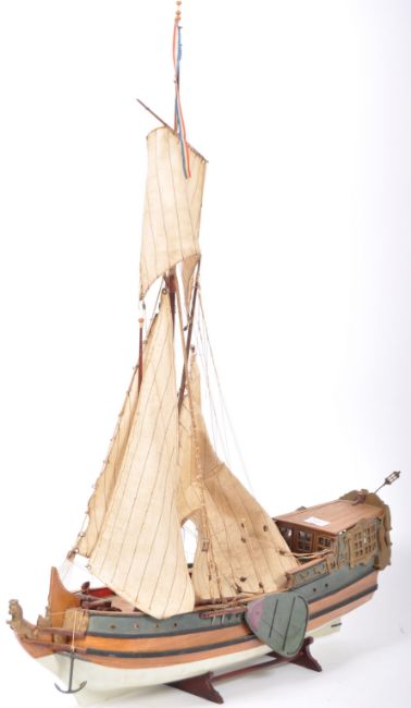 An impressive antique early 20th Century museum quality pond yacht type handmade scratch built model of a French Napoleonic maritime galleon frigate boat ship having single mast with four sails and french flag atop the crows nest. Detailed deck with cannons, cabins and lion mast to front. A highly detailed example. Measures approx: 97cm x 76cm.