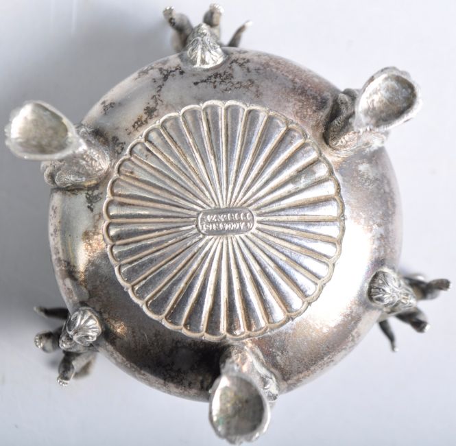 An antique 19th Century Italian silver table salt by G Accarsis Firenze. Features a central bowl with adorned cherub figurines, rams heads and raised on acanthus leaf hairy paw feet. A good decorative table condiment. Measures approx 4cm x 6cm. Weighs: 60.4 grams. In good condition with no visible dents or splits.