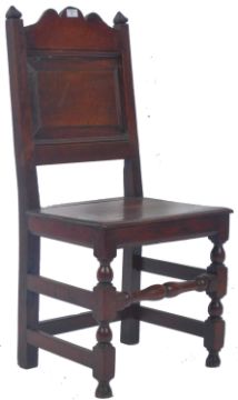 An antique 17th Century English dining / hall chair of oak construction having a paneled oak backrest with angular finials and central carved scroll decoration. The three quarter panel backrest terminating to a single panel seat rest raised on block and turn supports united by stretchers around with a single turned stretcher to the front. Measures approx 101cm x 47cm x 39cm.