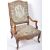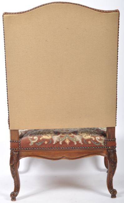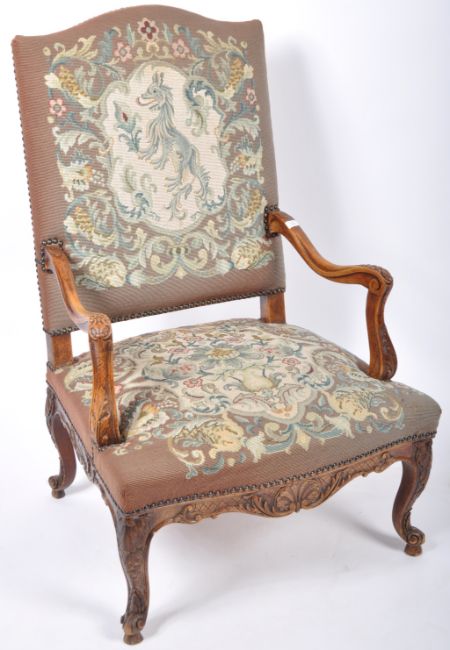 A large and impressive antique 18th Century Georgian English walnut framed tapestry armorial armchair / elbow chair. The chair having a tall arched backrest with central Heraldic lion cartouche with scroll and floral detailing throughout. Decorative carved scroll armrests and carved shell afront with brass studs throughout. Raised on carved cabriole supports. Measures approx  115cm x 69cm x 59cm.
