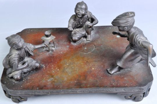 An impressive antique 19th Century Chinese Oriental bronze figural street scene diorama desk tidy of large size featuring a seated figure holding a pot, another figurine seated with bag over shoulder, a small side table with prayer bowl atop and an alter standing figure. Highly detailed figures with traditional clothing. All raised on the canted rectangular base with Greek Key borders and shaped feet. No visible makers marks. The pot is loose but present. Measures approx; 17cm x 29cm x 20cm.