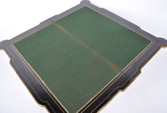 An antique 19th Century French Boullework / Boulle Work ebonised swivel top card table / games table. Stunning brass inlaid top with central horn and wheat motif surrounded by leaf border and floral medallion rosettes to the corners. The fold over lip opening to reveal a spacious interior storage compartment and green lined felt playing area. The sides further decorated and having applied ormolu brass details. All raised on turned reeded tapering legs. A trully impressive example. Measures 70cm / 68cm x 85cm x 43cm / 91cm.