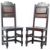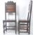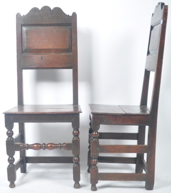 A pair of antique 17th Century English dining / hall side chairs of oak fielded panel construction having decorative carved scroll topped backrests with single panel back. The backrest terminating to oak panel seat rest raised on block and turn supports united by stretchers around with a single turned stretcher to the front of each. One marked AT. Each chair measures approx 109cm x 45cm x 38cm.