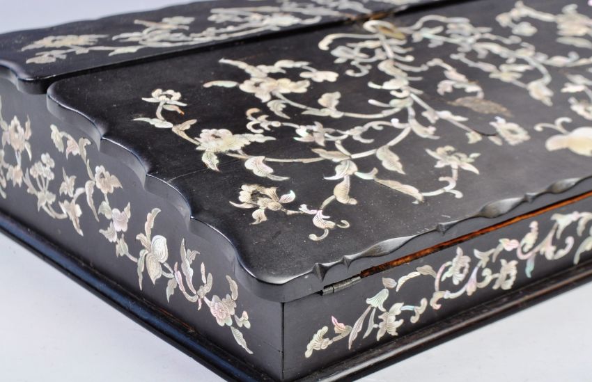 A 19th Century Chinese antique black lacquer and mother of pearl writing slope box having inlaid decoration with scrolling leaves, flowers and butterflies. The box of serpentine form with hinged twin lid opening to reveal a fully appointed interior featuring a writing sciver, desk tidy and secret compartment. Measures: 9cm x 37cm x 25cm.
