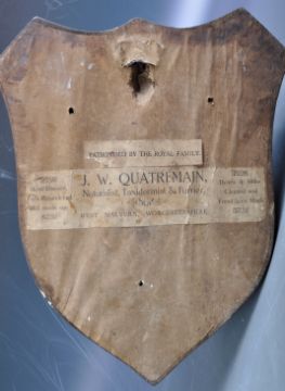 Taxidermy & Natural History Interest - Red Fox Mask (Vulpes vulpes) - An early 20th Century taxidermy fox head, preserved the animal with glass eyes and mouth open snarling with original teeth. Set to a period oak shield. Brass plaque reading Killed March 25 1927 likely on a hunt. Label to verso reading JW Quatreman Patronised By The Royal Family. Measures approx 18cm x 22cm x 30cm roughly.