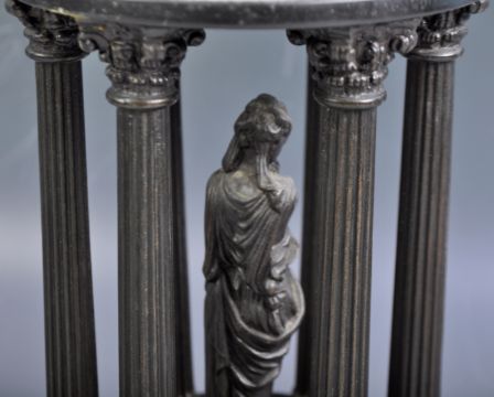 An antique 19th Century Italian Grand Tour black slate and bronze sculpture in the form of the The Temple Of Diana located in the Villa Borghese. Domed top with flame finial, classical scenes having central figure of Diana the Huntress surrounded by Corinthian columns raised on stepped circular base. A great display piece. Measures approx: 34cm tall.