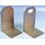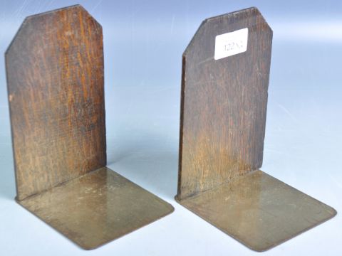 A pair of antique 19th Century English Arts and Crafts oak and brass bookends having a canted chapered edge with applied gilt brass heraldic lion face masks to side. Great display pieces. Measures: 17cm x 10cm x 11.5cm