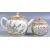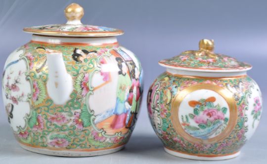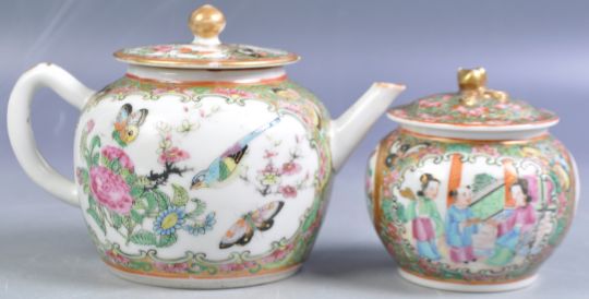 An antique 19th Century Chinese Oriental Cantonese Canton Region Famille Rose teapot and lidded sugar bowl having 'C' scroll bordered white cartouche panels depicting court scenes, figures, butterflies, birds of paradise and floral sprays. Detailed gilded and leaf scroll decoration throughout. Measures approx 10cm tall. Condition; bowl having small chip to underside on foot.
