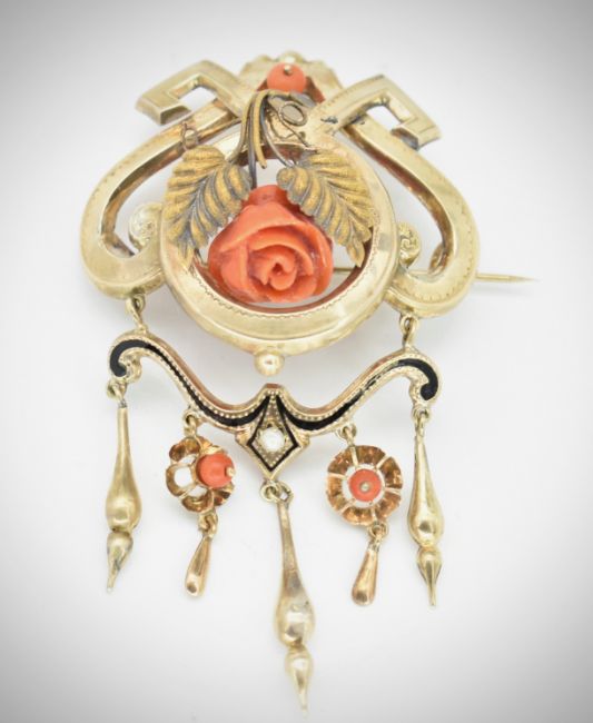 A cased 19th century Victorian earring and brooch parure.  The brooch and earrings having carved coral roses set amongst foliates and etched gold mounts with coral set pendants having pearl and enamel decoration in fitted lined case. Unmarked tests indicate 9ct gold and higher. Brooch measures 6.8cm x 3.8cm excluding pin. Weight 8.2g. Earrings approx 6cms length. Weight 5.1g.
